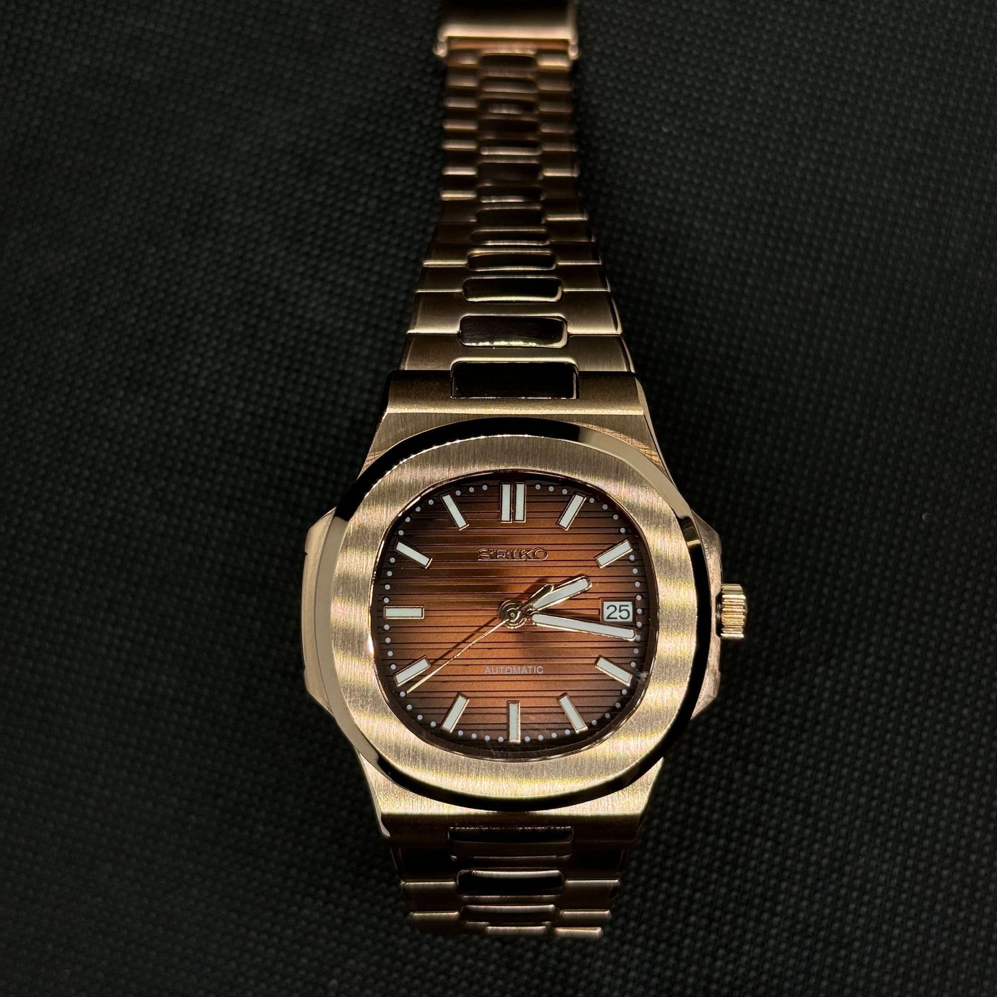 Inspired by the iconic Nautilus design, and featuring the prestigious Seiko NH35 automatic movement, we present the Seiko Mod Nautilus. A 41 mm high-end quality watch combining the perfect alliance between excellence and accessibility.