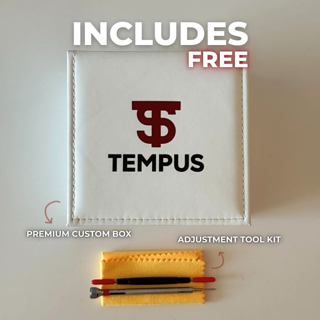 At Tempus, we go beyond watches. Each timepiece comes in a premium custom box with a free adjustment kit for the perfect fit, reflecting our commitment to quality and detail.